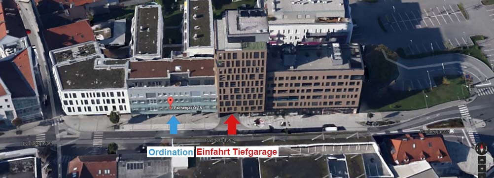 Direkt vor der Ordination halten die Busse der Linien: 1, 2a, 2/4, 3, 3b, 6